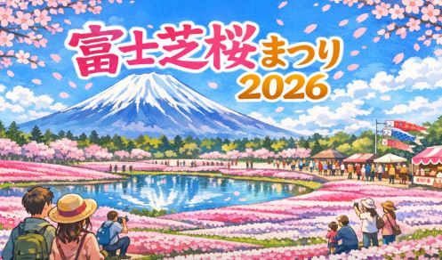 富士芝桜まつり2026は、首都圏最大級の芝桜イベントとして毎年多くの来場者が訪れます。約50万株の芝桜が富士山のふもとに広がる景色は圧巻で、春の富士五湖エリアを代表する風景と言えるでしょう。