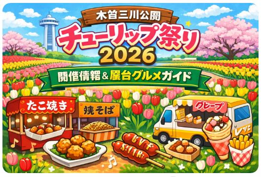 春の定番イベントとして人気の「木曽三川公園チューリップ祭り」。色とりどりのチューリップ畑を楽しみながら、屋台やキッチンカーグルメを目当てに訪れる人も多いですよね。とくに2026年の開催では、どんな出店があるのか気になっている方も多いはずです。