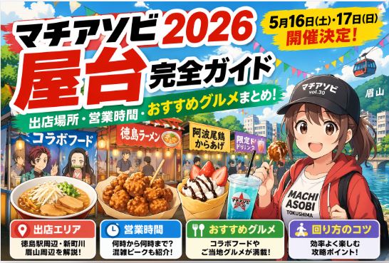 マチアソビ2026の屋台グルメは、コラボフードとご当地グルメの両方を楽しめる点が最大の魅力です。現時点で具体的な出店内容は未発表ですが、過去の傾向から見るとアニメ作品とのコラボメニューと、徳島ならではの食材を使った屋台がバランスよく並ぶ可能性が高いでしょう。